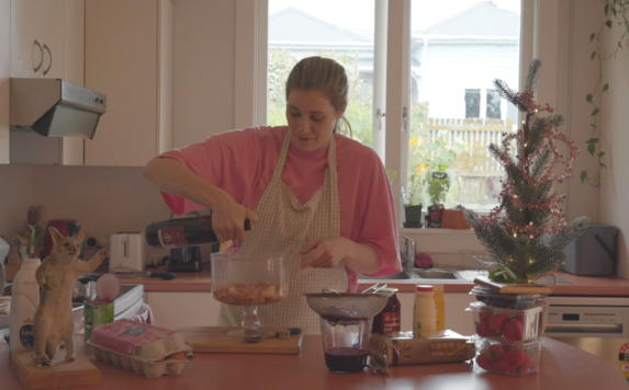 Comedian Brynley Stent makes her Oma's trifle, with help from a taxidermy possum | Comedians Cook