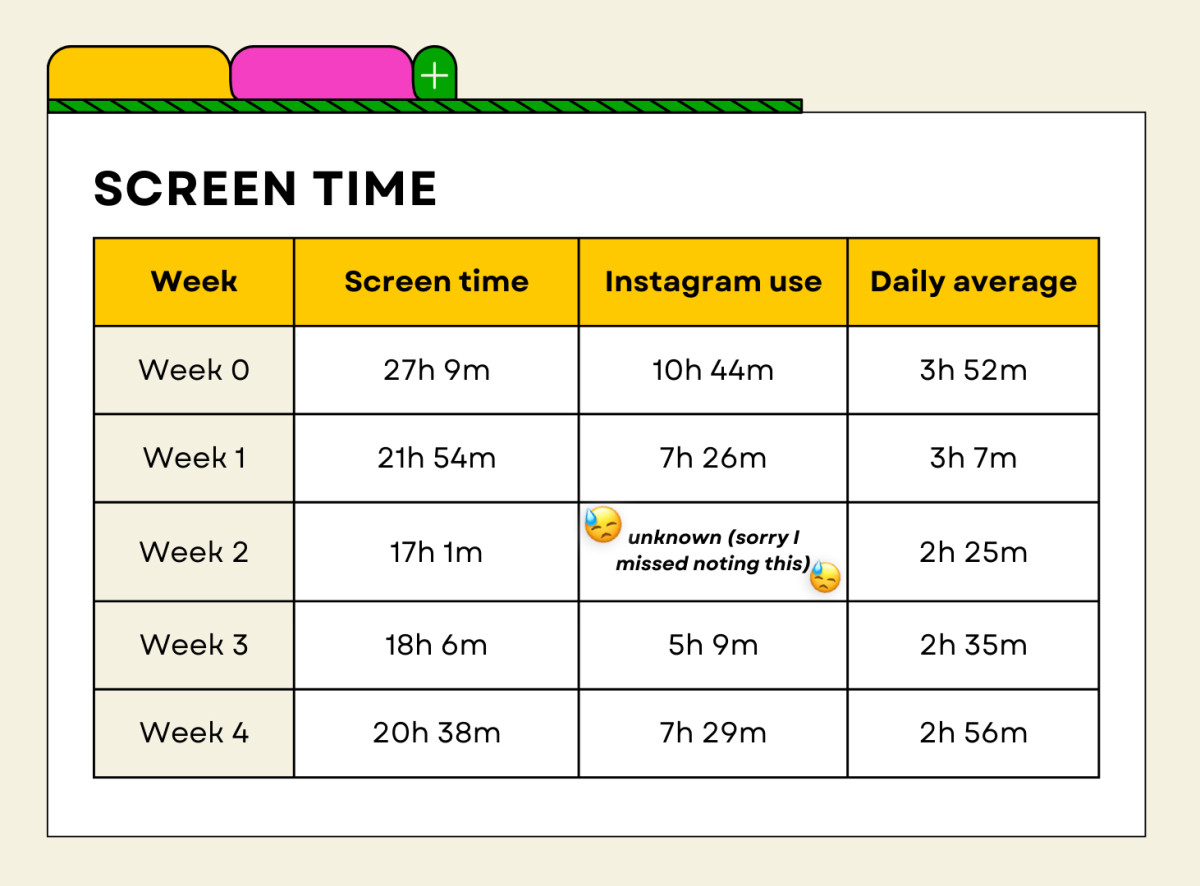 The week before I started my month-long experiment, my screen time averaged about 27 hours weekly, of which 11 hours - more than a full working day - was spent on Instagram.